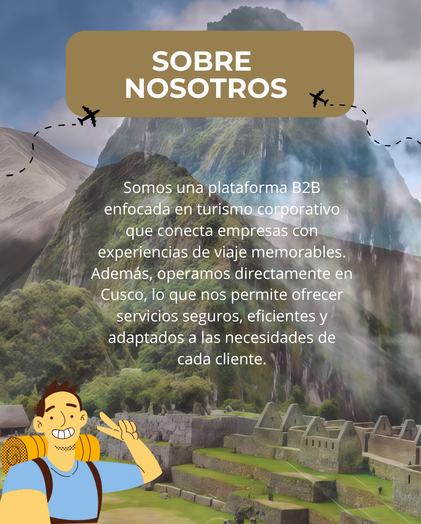 Somos una plataforma B2B enfocada en turismo corporativo que conecta empresas con experiencias de viaje memorables. Además, operamos directamente en Cusco, lo que nos permite ofrecer servicios seguros, eficientes y adaptados a las necesidades de cada cliente.
